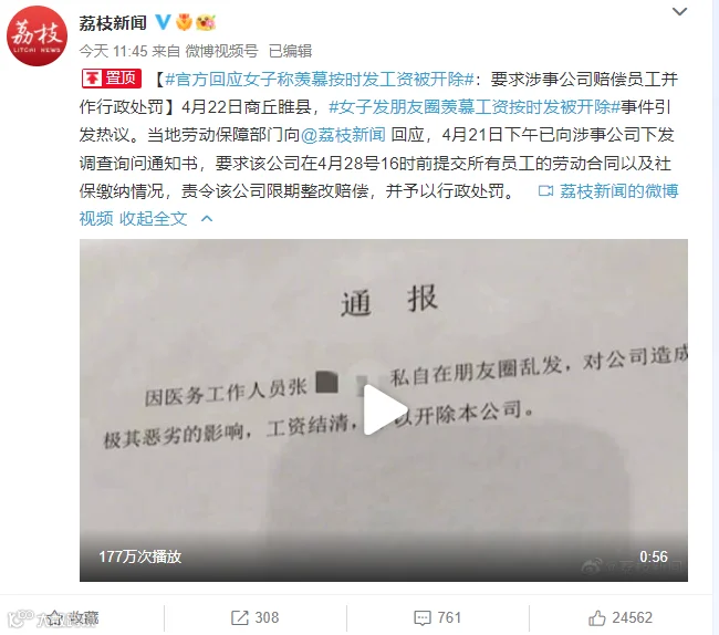 女子发朋友圈称羡慕按时发工资被开除?官方回应