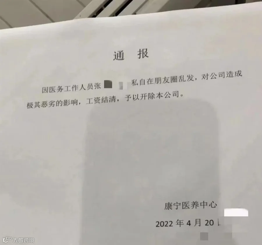 4月21日,张女士发布网贴称,自己被“康宁医养中心”辞退,