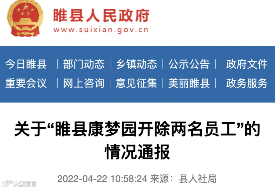 据睢县人民政府网站22日消息,睢县人力资源和社会保障局通报,4月21日,针对网上反映睢县康梦园医养保健服务有限公司(原康宁医养中心)开除员工一事,睢县人力资源和社会保障局劳动保障监察大队