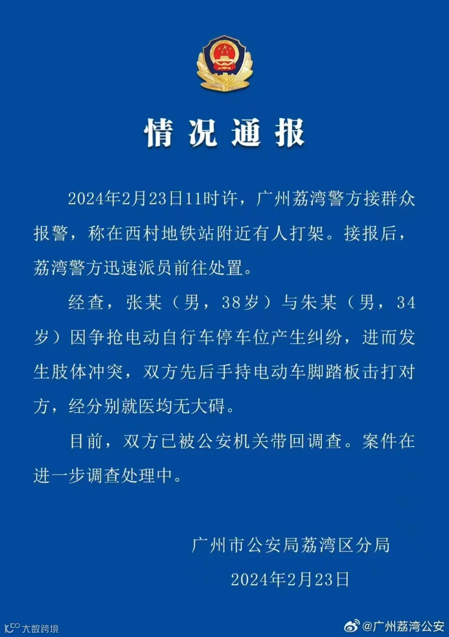 2024年2月23日11时许,广州荔湾警方接群众报警,称在西村地铁站附近有人打架。接报后,荔湾警方迅速派员前往处置。