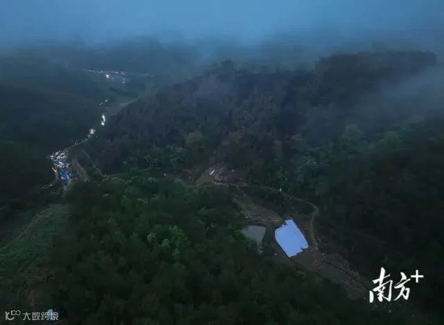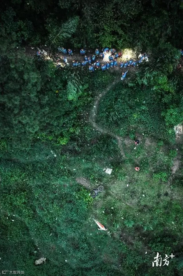 3月23日下午6时,搜救现场陆续亮起了灯光,天空下着小雨,与昨日相比,山林被新挖开了不少,公安、民兵、应急、工程人员以及政府工作人员在现场值守,各司其职。