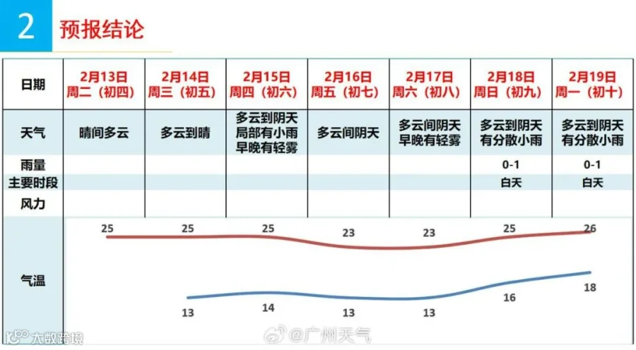 13日(初四),广东西部的部分市县多云间阴天,有零星小雨,早晚有(轻)雾,其余市县多云;气温继续回升。