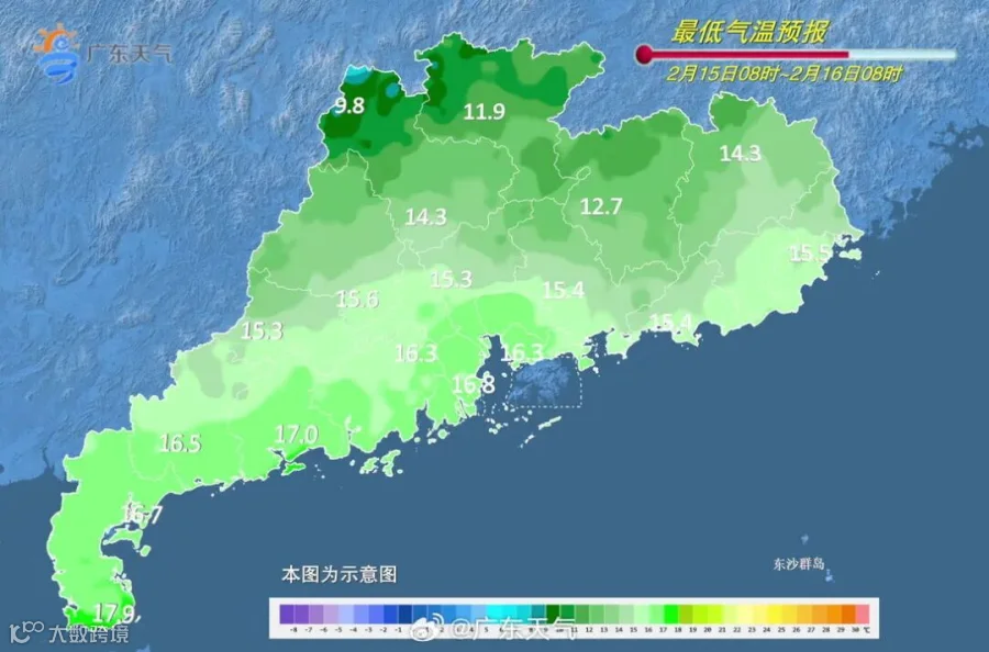 15日(初六),韶关和清远市县阴天有小雨,气温略降;其余市县多云到阴天,有分散性零星小雨,中西部市县早晚有(轻)雾,气温继续回升。早晨最低气温:粤北和粤东市县11~14℃,雷州半岛16~19℃,其余市县14~16℃。