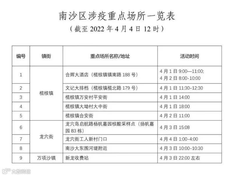 2022年4月3日,南沙区在重点人员例行核酸检测筛查中发现1名核酸检测结果异常者。因疫情防控需要,我区以下场所被列为涉疫重点场所,详见附表。有关后续情况将及时通报。