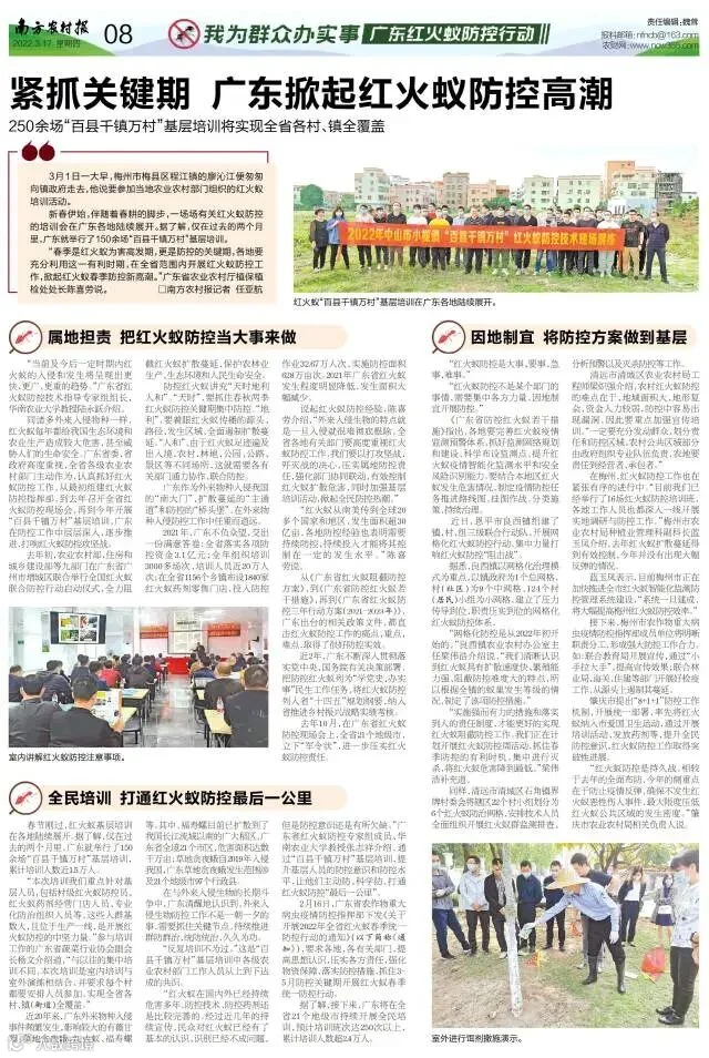 广东省委、省政府高度重视,全省各级农业农村部门主动作为,认真抓好红火蚁防控工作,从最初组建红火蚁防控指挥部,到去年召开全省红火蚁防控现场会,再到今年开展“百县千镇万村”基层培训,广东在防控工作中层层深入、逐步推进,打响红火蚁防控攻坚战。