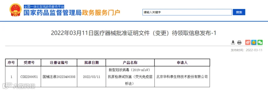 根据华大医学微信公众号消息,2020年12月,华大因源研制的新型冠状病毒抗原检测试剂盒取得了国家药品监督管理局颁发的医疗器械注册证。该试剂盒采用免疫层析夹心法,结合荧光微球作为示踪标记物,对疑似新冠病毒感染人群的口咽拭子、鼻咽拭子样本中的新冠病毒N抗原进行检测。该检测试剂盒具有检测敏感性高、特异性强、稳定性好、结果快速等特点。