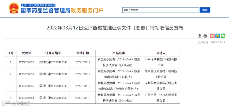 3月12日,国家药监局发布通告批准5款新冠抗原自测产品上市,其中,2款为广东企业研发生产。