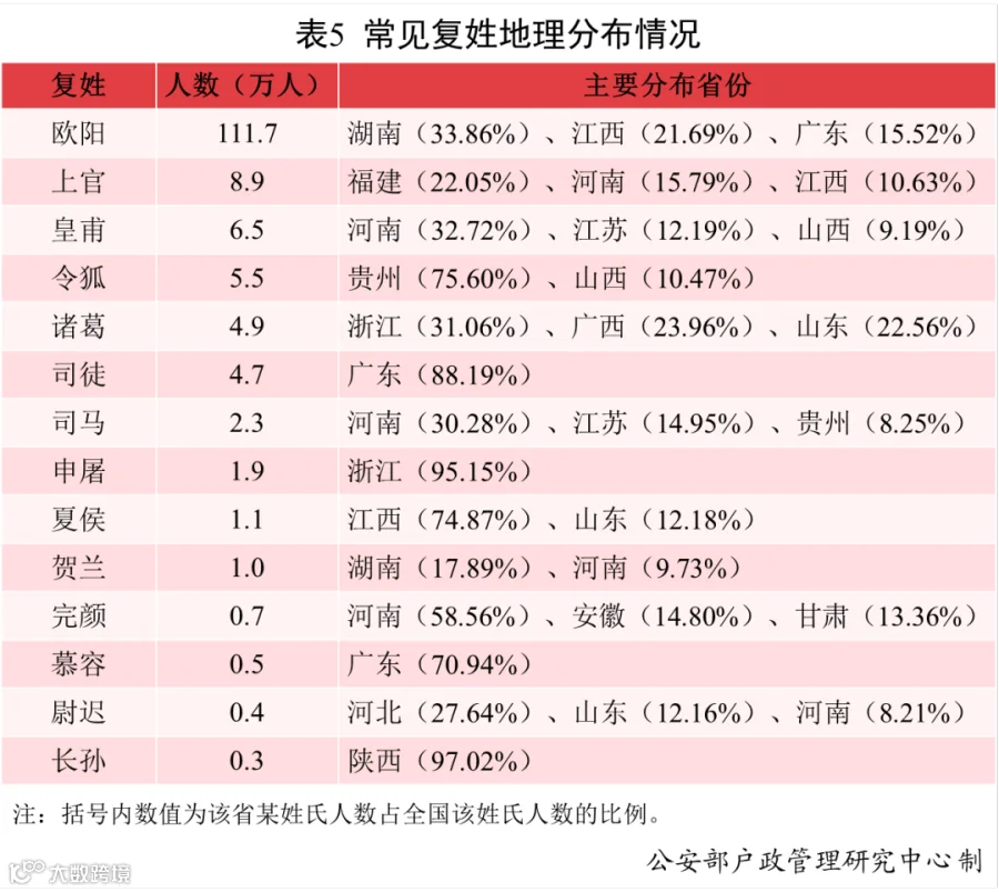 常见复姓“聚居”的特点非常突出,复姓人口在个别省份的分布较为集中。
