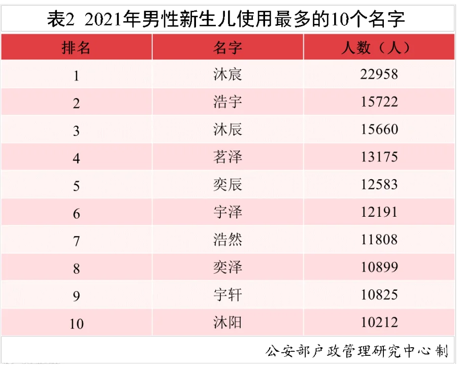 2021年出生并已经进行户籍登记的男性新生儿中,使用频率最高的10个名字依次为:沐宸、浩宇、沐辰、茗泽、奕辰、宇泽、浩然、奕泽、宇轩、沐阳。与2020年相比,除浩宇、奕辰、宇轩外,其余名字首次进入前十,其中“沐宸”使用人数达到2.3万,登顶榜首,成为男性新生儿名字首选。