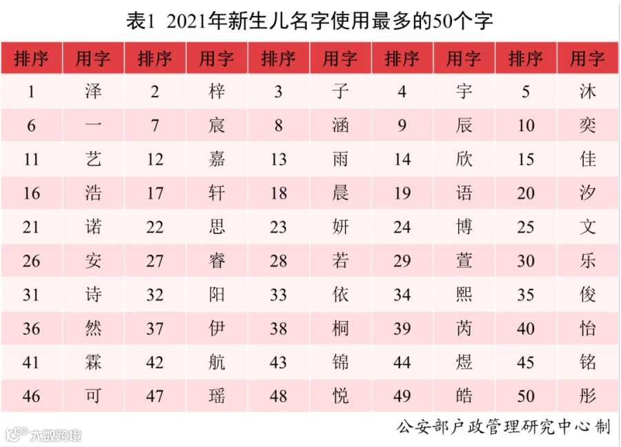 2021年出生并已经进行户籍登记的新生儿名字中,使用频率最高的50个字依次为泽、梓、子、宇、沐等。与2020年相比,汐、芮、霖、航等字受到青睐。