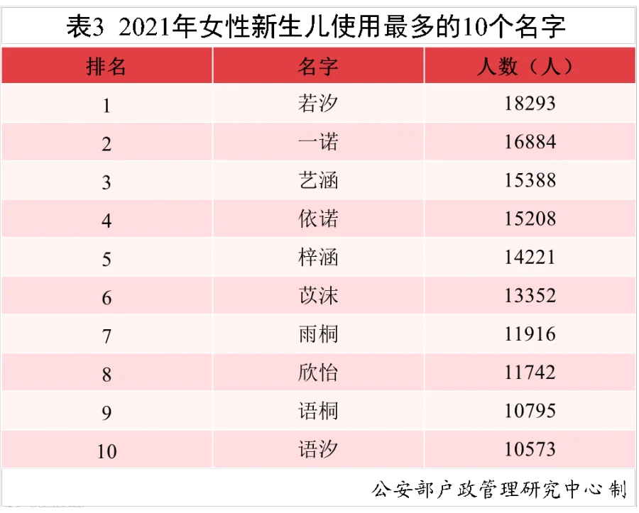2021年出生并已经进行户籍登记的女性新生儿中,使用频率最高的10个名字依次为:若汐、一诺、艺涵、依诺、梓涵、苡沫、雨桐、欣怡、语桐、语汐。与2020年相比,若汐、艺涵、苡沫首次进入前十,其中“若汐”使用人数达到1.8万,登顶榜首,成为女性新生儿名字首选。