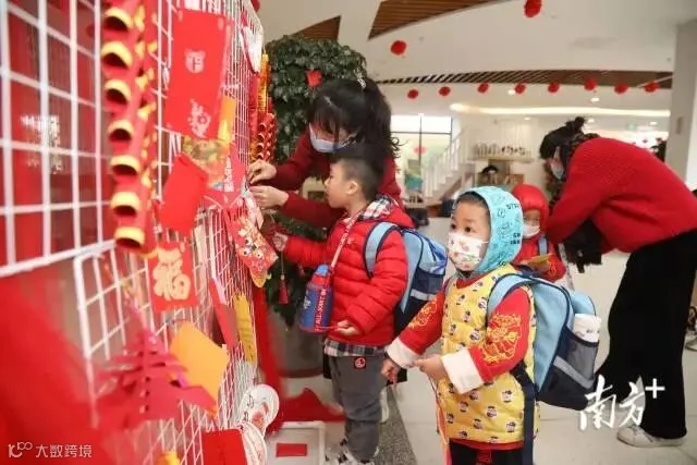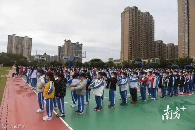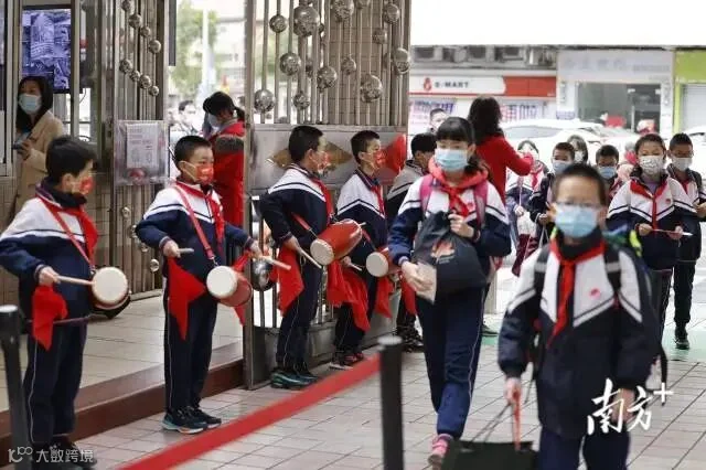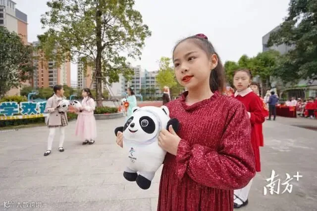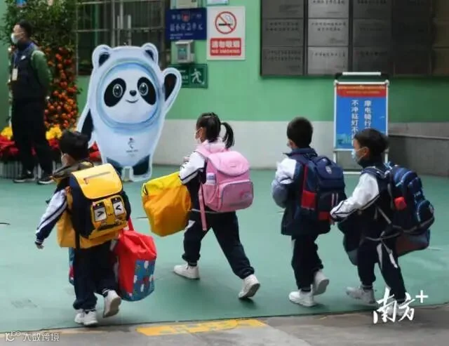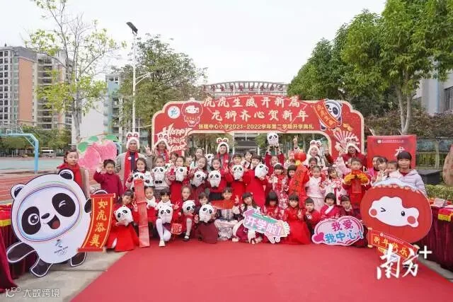 开学第一天,佛山张槎中心小学校门口,孩子们手拿“冰墩墩”迎接学生开学,学校还准备了包括龙狮娃抓虎福等多种形式迎接开学。