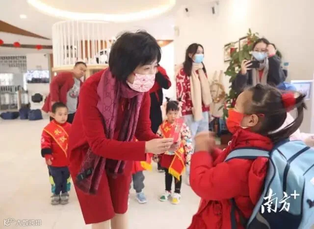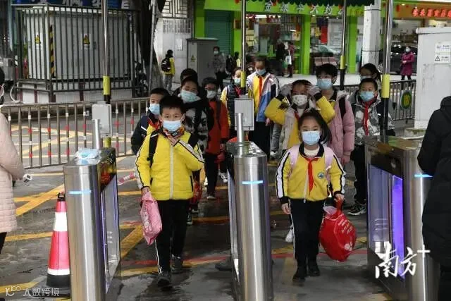 2月14日上午,广州市海珠区昌岗中路小学迎来了新学期返校的学生。学校老师向每位同学派发写有“2022 一起向未来”的红色口罩,学生接过印有祝福语的口罩,意味着新学期正式开启。