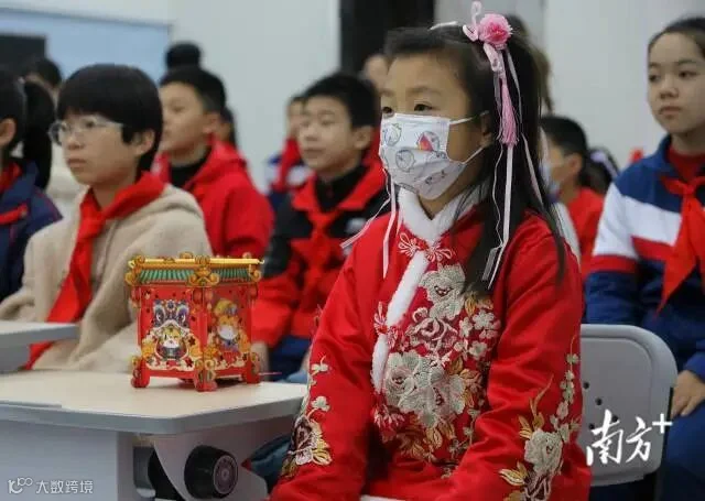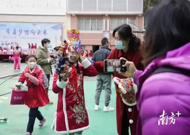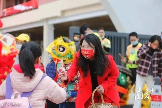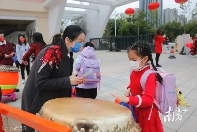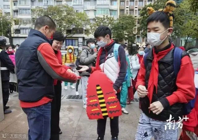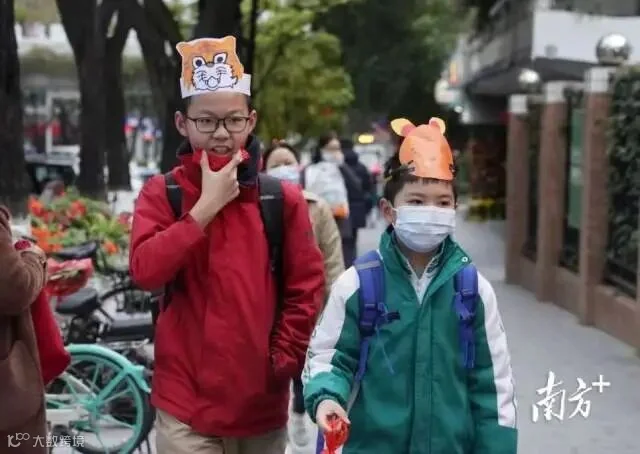 广州东风东路小学,醒狮迎开学,学生佩戴手工虎年头饰,接过老师派发的新学期礼物,走进校园参加学校开学典礼。