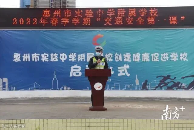 惠州市实验中学附属学校开学典礼上,举行升旗仪式和邀请交警开展交通安全第一课。