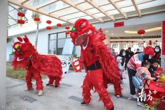 有舞动舞狮的、派发棒棒糖的