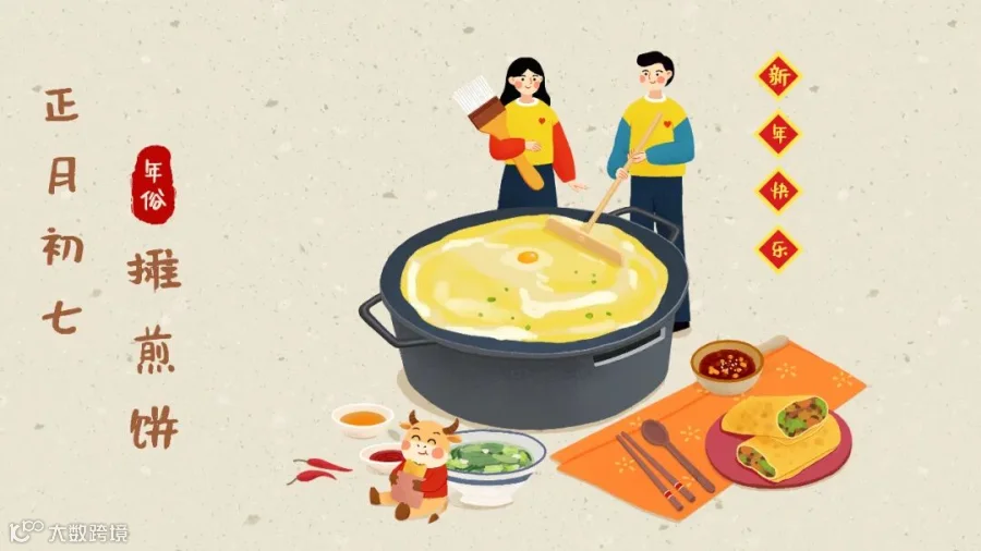 古时候正月初七这天,人们会在自家院子摊煎饼,这样做寓意新一年里五谷丰登。有一种习俗是在院子里摊煎饼,并且吃用春饼卷的“盒子菜”,里面卷的是各种熟食,包括熏大肚、炉肉、清酱肉、酱肘子、熏鸡等。另有一种说法是,初七这天摊煎饼寓意“熏天”,因为是在院子里搭的灶台,加上烧的是木头,这样就会升起缕缕炊烟,这种景象看上去很有“气势熏天”的架势。