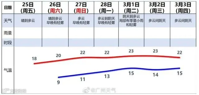 广州市区,25日,晴到多云,早晚有轻雾,气温介于6℃-18℃之间;26日,晴到多云,早晚有轻雾,气温介于8℃-20℃之间;27日,多云,早晚有轻雾,气温介于11℃-22℃之间。
