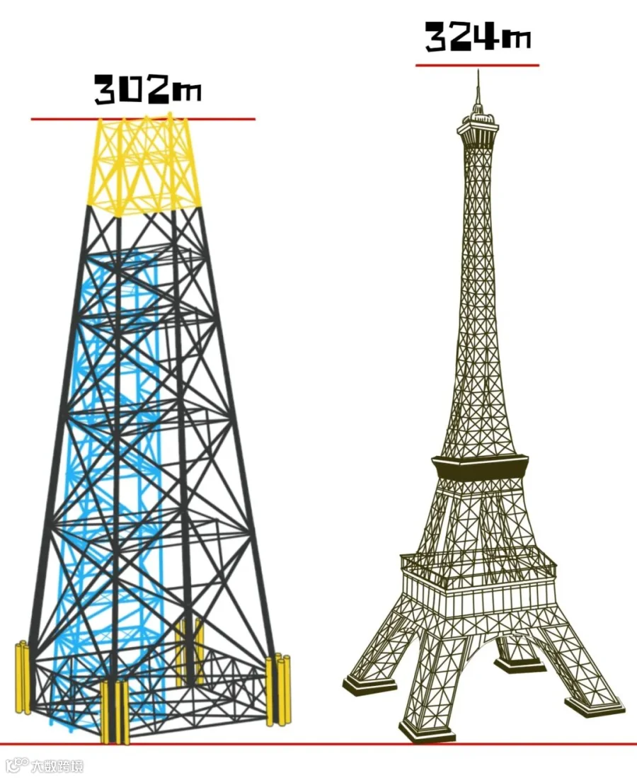 “海基一号”总高度达302米,与埃菲尔铁塔高度接近,是亚洲首例300米级深水导管架。其总重量达3万吨,所用钢铁可制造1艘中型航空母舰。