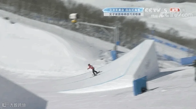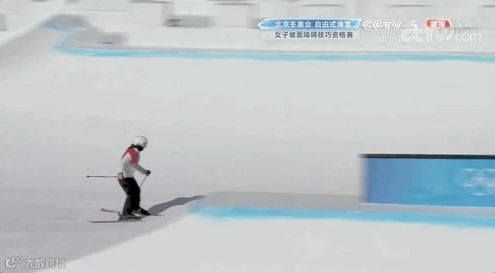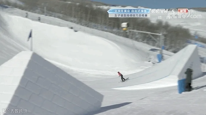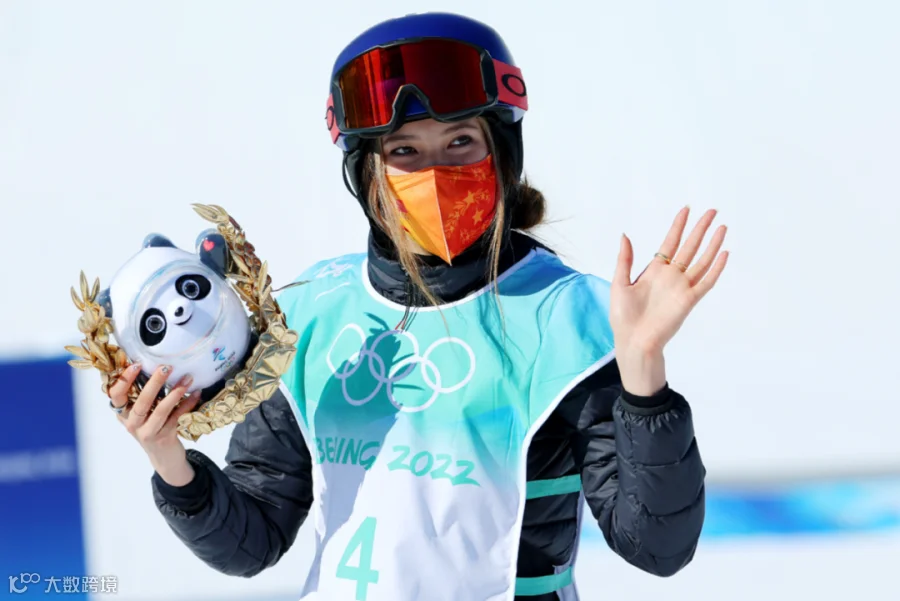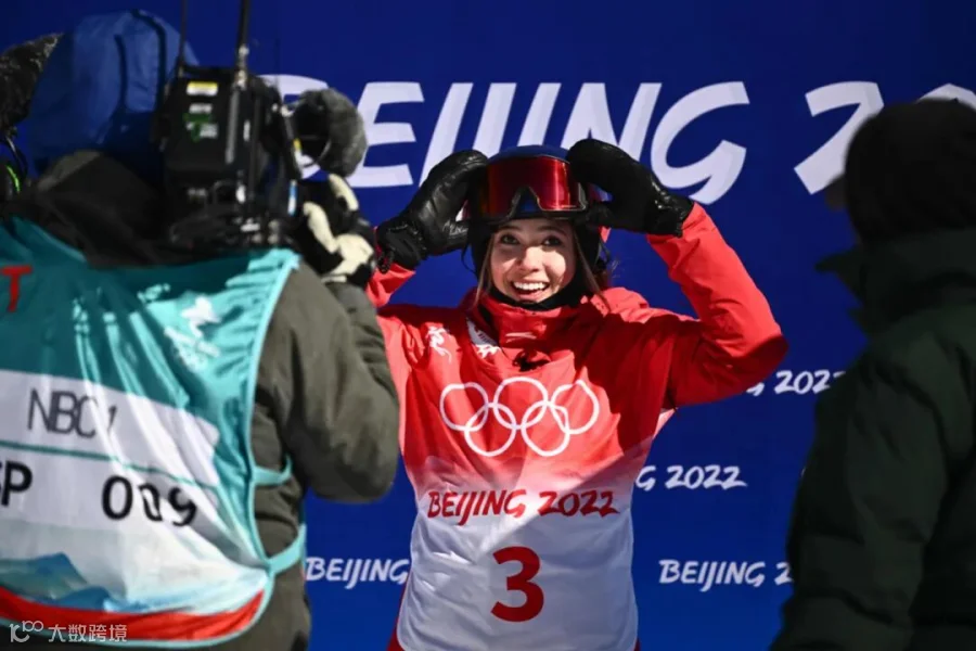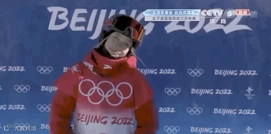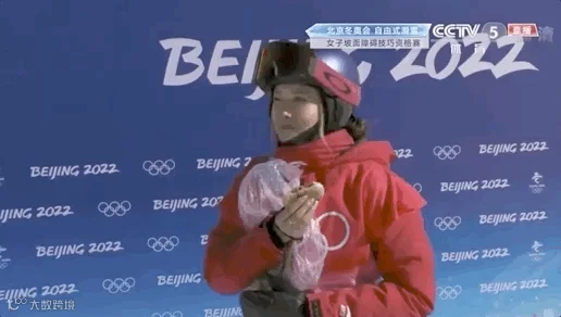 第二轮动作完成后,谷爱凌开心地边吃馅饼边等成绩。