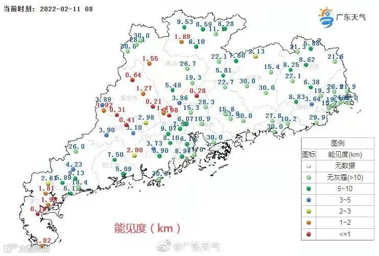 11日,韶关、清远、肇庆北部市县阴天有小雨,其余市县多云到阴天,局部有零星小雨。中西部市县有(轻)雾。