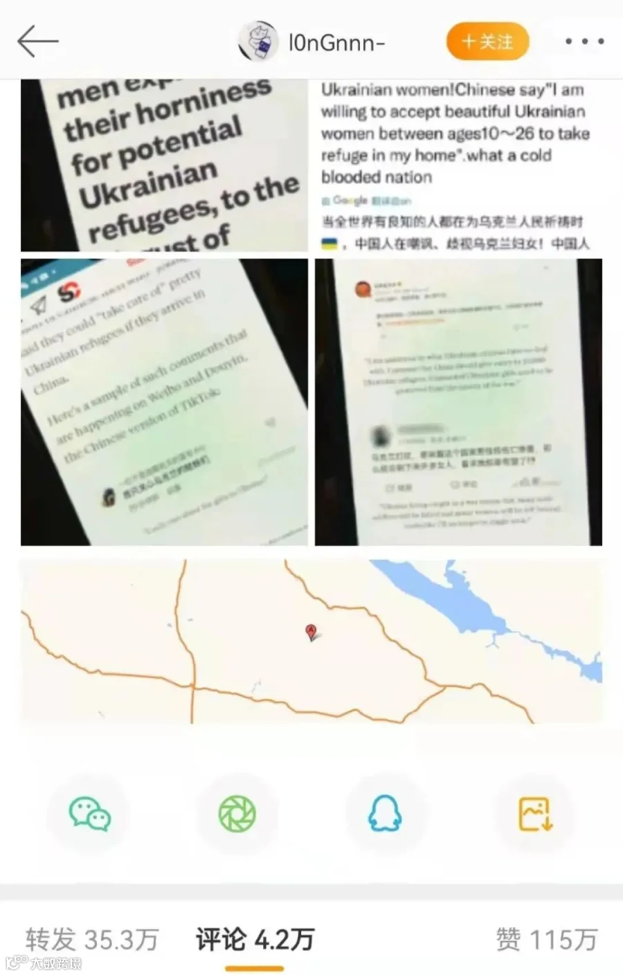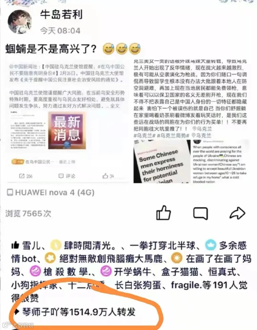 再由ID为@Karwan70446933 的账号进行英文转译,从而引发第一波的关注。之后,一个域名为supchina.com的网站以此舆论为噱头,发布了题为《Some Chinese men express their horniness for potential Ukrainian refugees, to the disgust of netizens》的文章,将所有矛头导向中国网民。这类信息随后被传入在乌克兰的华人圈,并引起了一部分华人的警惕,不少人将此信息发布在中国大陆的微博平台,其中微博ID为I0nGnnn-账号(目前搜寻不到该账号)发布的信息点爆了舆论场,获得了超6万转发,近50万点赞,千万级阅读量的传播。同时,QQ空间ID为@牛岛若利 的账号发布的相关信息,也在特定青少年群体中获得了1500多万的转发。