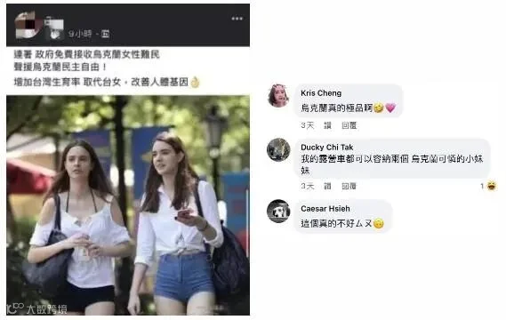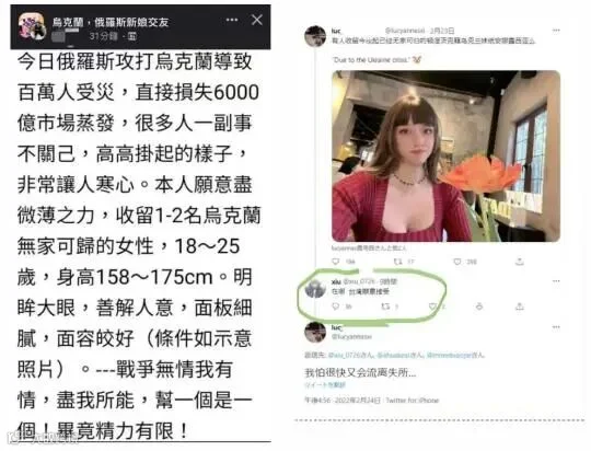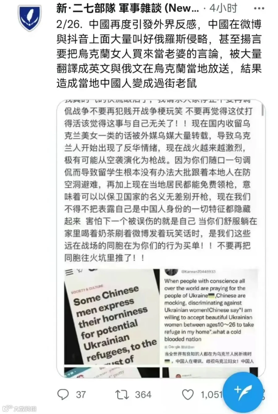 这类言论虽比不上西方舆论嘲讽乌克兰为“欧洲子宫”般恶毒,但在乌克兰危难时刻,如果被乌克兰人民看到,带给他们的负面观感是不言而喻的。因而,对于此类言论不论有没有在乌克兰舆论场得到传播,都是应该坚决反对的。不过我们也应该注意到另外一个现实,中文世界的个别极端信息是如何被炒作进乌克兰舆论场的?事实上,这类言论并非只是中国大陆的个别网民在发布,如下列截图,一批包括台湾账号在内的境外账号都发布了类似信息: