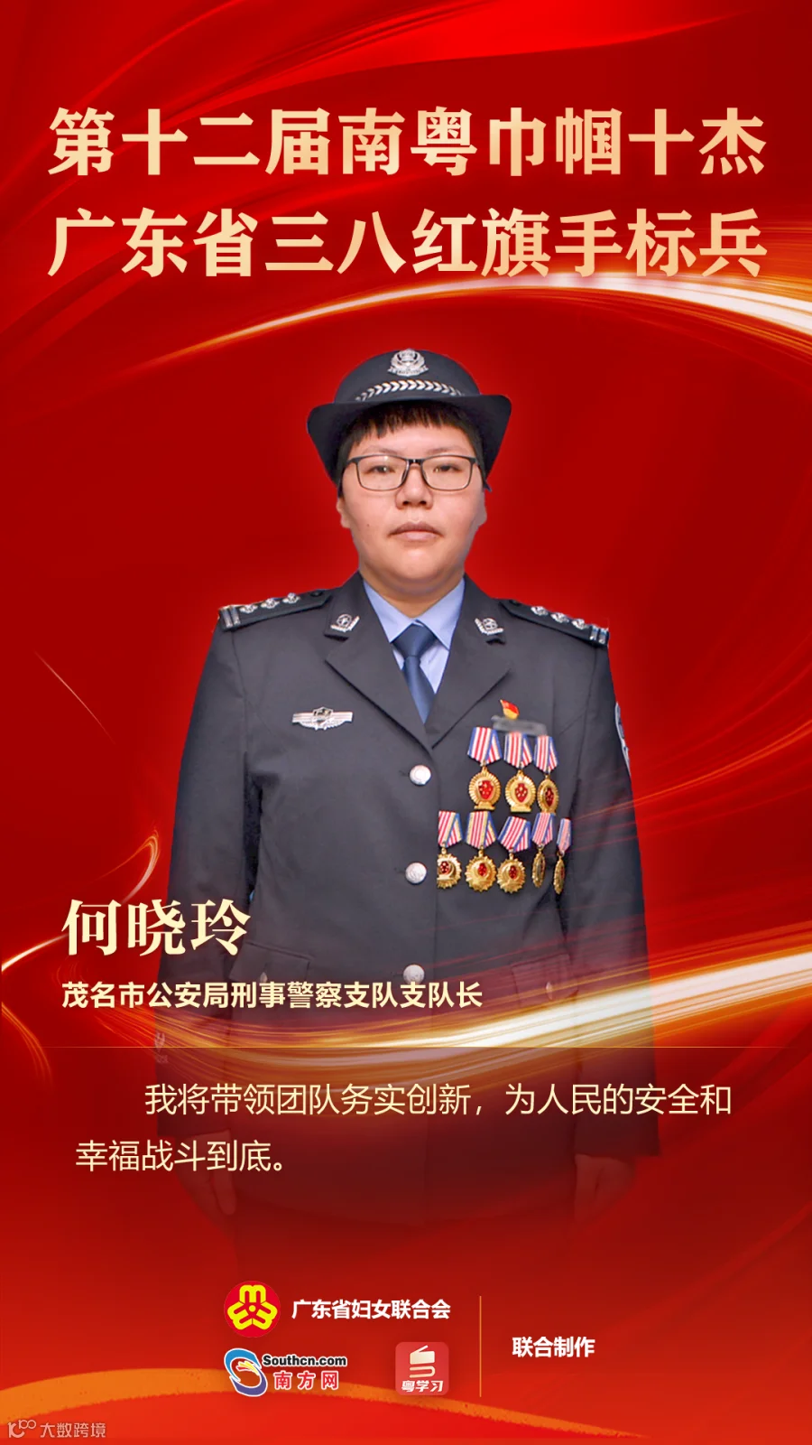 公安部评定的全国公安专业人才,从警以来务实创新,屡破大案,精于研判,擅打硬仗,到任3个月就组织侦破6宗超过15年的命案积案,是广东公安近20余年唯一的女刑警支队长。创立的工作机制被全省推广,为广东战疫贡献了智慧。牵头创新研发建设的模型拓宽扫黑除恶线索来源,保持对黑恶势力的凌厉攻势,勇夺全国公安数据建模竞赛一等奖,三年来支撑打掉涉黑组织数在全省名列前茅。积极探索追逃新机制,创新追逃技战法,为追逃研发的APP获得2020年度公安移动应用创新专项工作优秀成果一等奖。全天候全手段打击各类违法犯罪,刑事警情连续3年下降。先后荣立个人二等功3次、三等功5次,评为广东省三八红旗手等。
