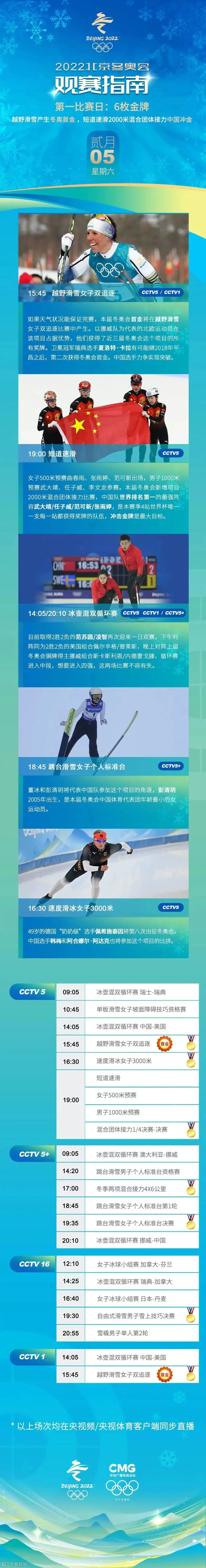 大幕已启,好戏登台。北京冬奥会将在5日迎来开幕后的首个比赛日,将产生六枚金牌。越野滑雪项目有望产生北京冬奥会首枚金牌,而中国的“王牌之师”短道速滑队将在混合团体接力项目上全力冲击中国代表团在本届冬奥会的首金。