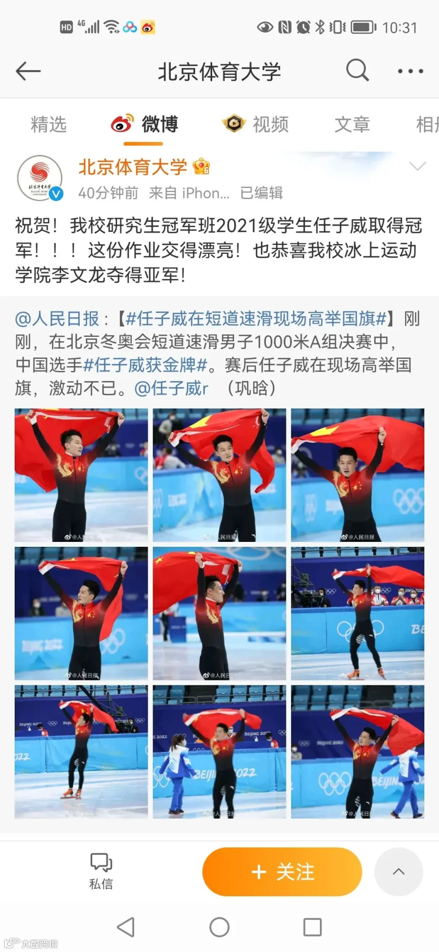 北京体育大学官方微博发文表示祝贺