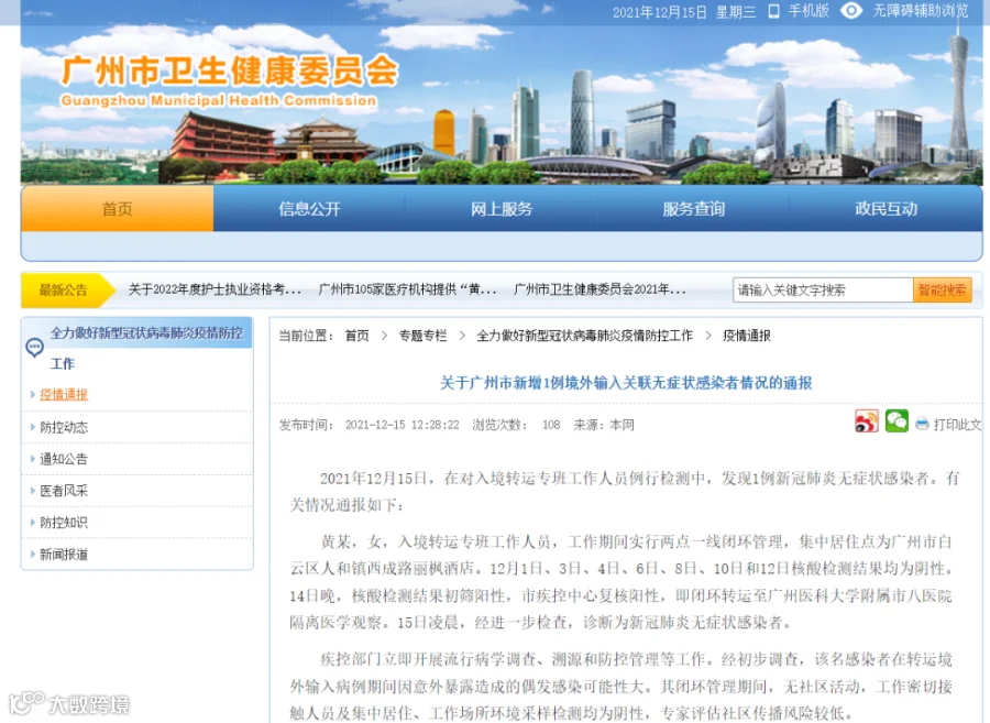 广州卫健委通报,2021年12月15日,在对入境转运专班工作人员例行检测中,发现1例新冠肺炎无症状感染者。有关情况通报如下: