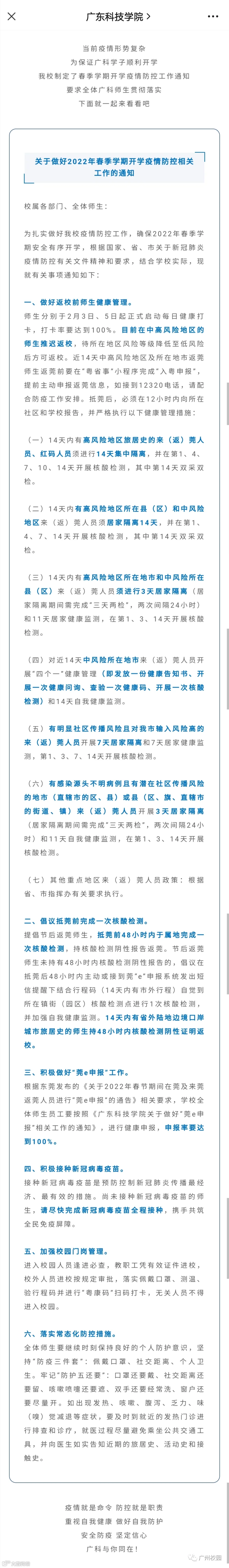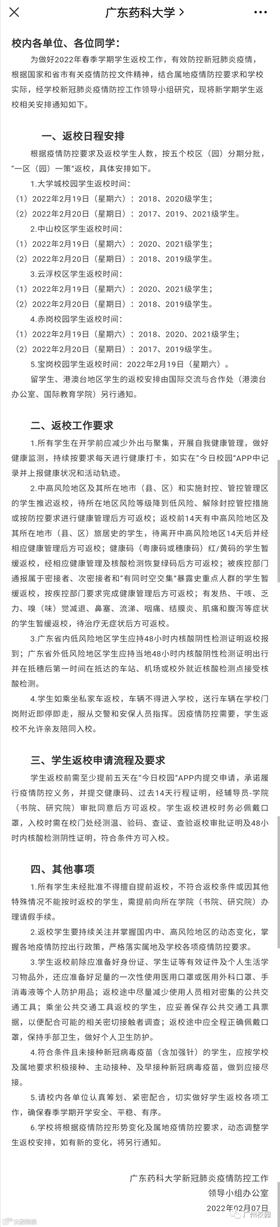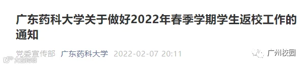2月7日,广东药科大学发布关于做好2022年春季学期学生返校工作的通知。