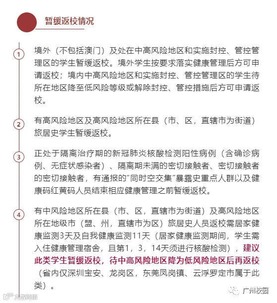 返校前14天有中高风险地区及其所在地市(县、区)旅居史的学生,待离开中高风险地区14天后并经相应健康管理后方可返校;健康码(粤康码或穗康码)红/黄码的学生暂缓返校,经相应健康管理及核酸检测恢复绿码后方可返校;
