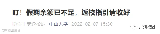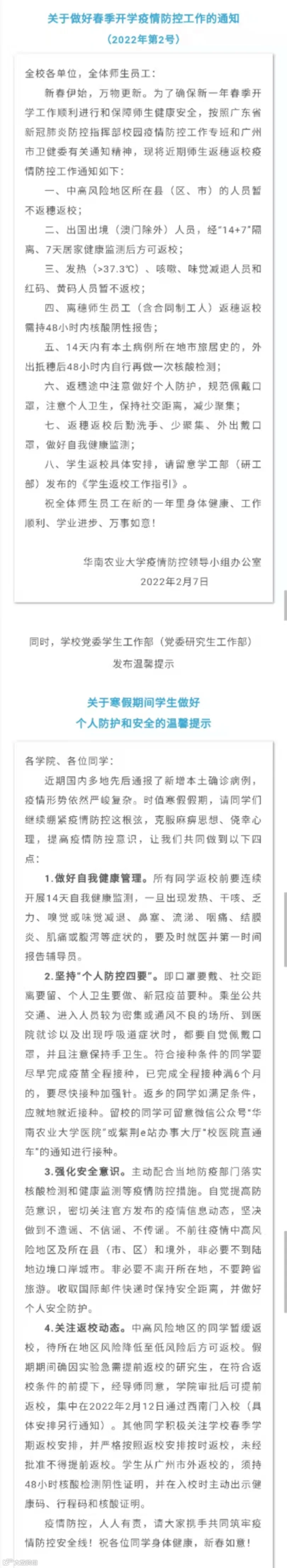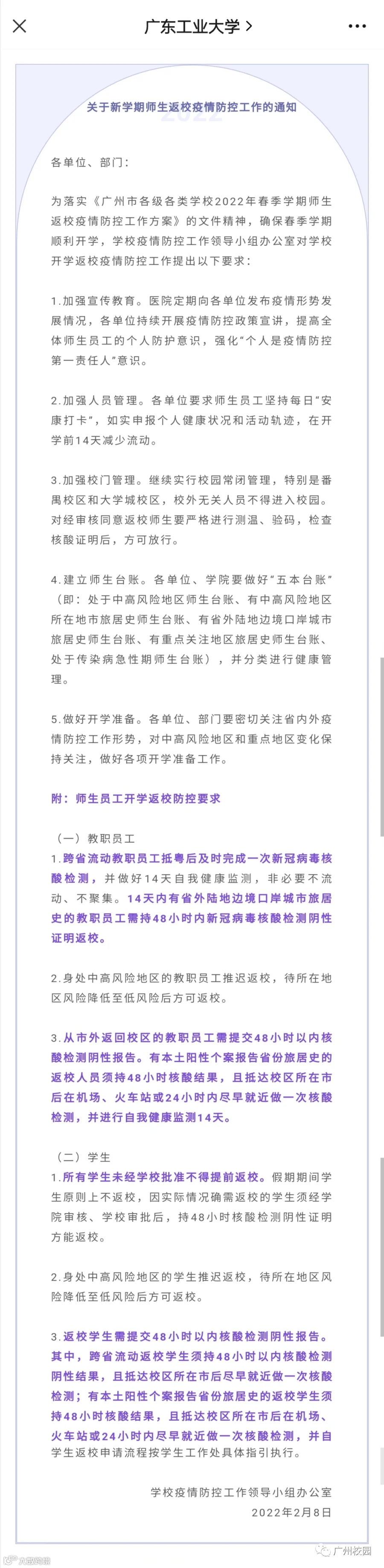 其他同学积极关注学校春季学期返校安排,并严格按照返校安排按时返校,未经批准不得提前返校。学生从广州市外返校的,须持48小时核酸检测阴性证明,并在入校时主动出示健康码、行程码和核酸证明。