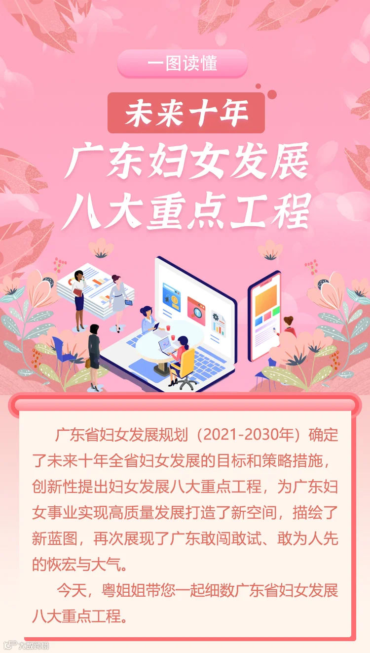 广东省妇女发展规划(2021-2030年)确定了未来十年全省妇女发展的目标和策略措施,创新性提出妇女发展八大重点工程,为广东妇女事业实现高质量发展打造了新空间,描绘了新蓝图,再次展现了广东敢闯敢试、敢为人先的恢宏与大气。