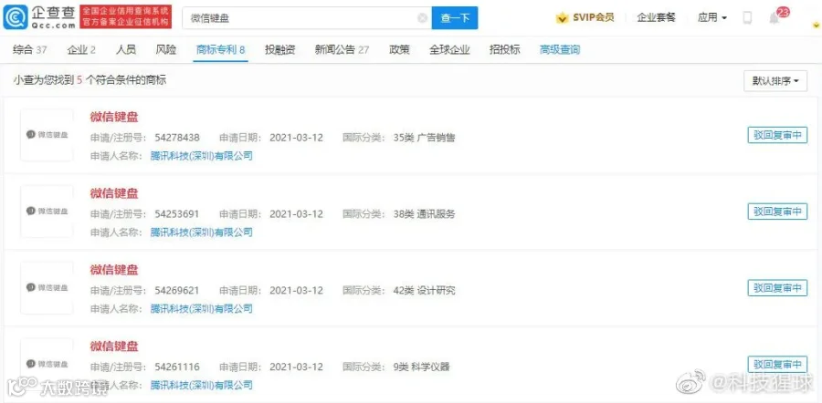 企查查App显示,腾讯公司已于2021年3月申请注册微信键盘商标,商标国际分类涉广告销售、通讯服务等。目前商标状态为驳回复审中。