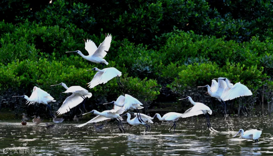 成群白鹭翩跹飞舞、嬉戏觅食