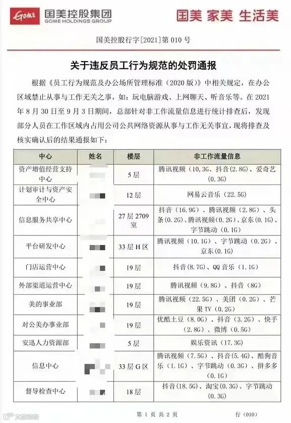 该通报显示,8月30日-9月30日期间,国美总部针对非工作流量信息进行统计排查后,发现部分员工在工作区域内占用公司公共网络资源从事与工作无关事宜,如玩电脑游戏、上网聊天、听音乐等。该司根据相关规定对11位员工作出处罚,并予以通报。