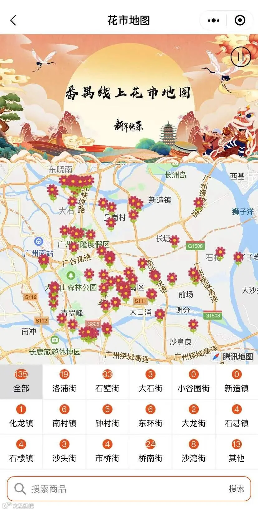其中,“花市地图”板块集合了全区100多个桔场、花场、摆卖点,按镇街分门别类地列好,大家可以前往查询。