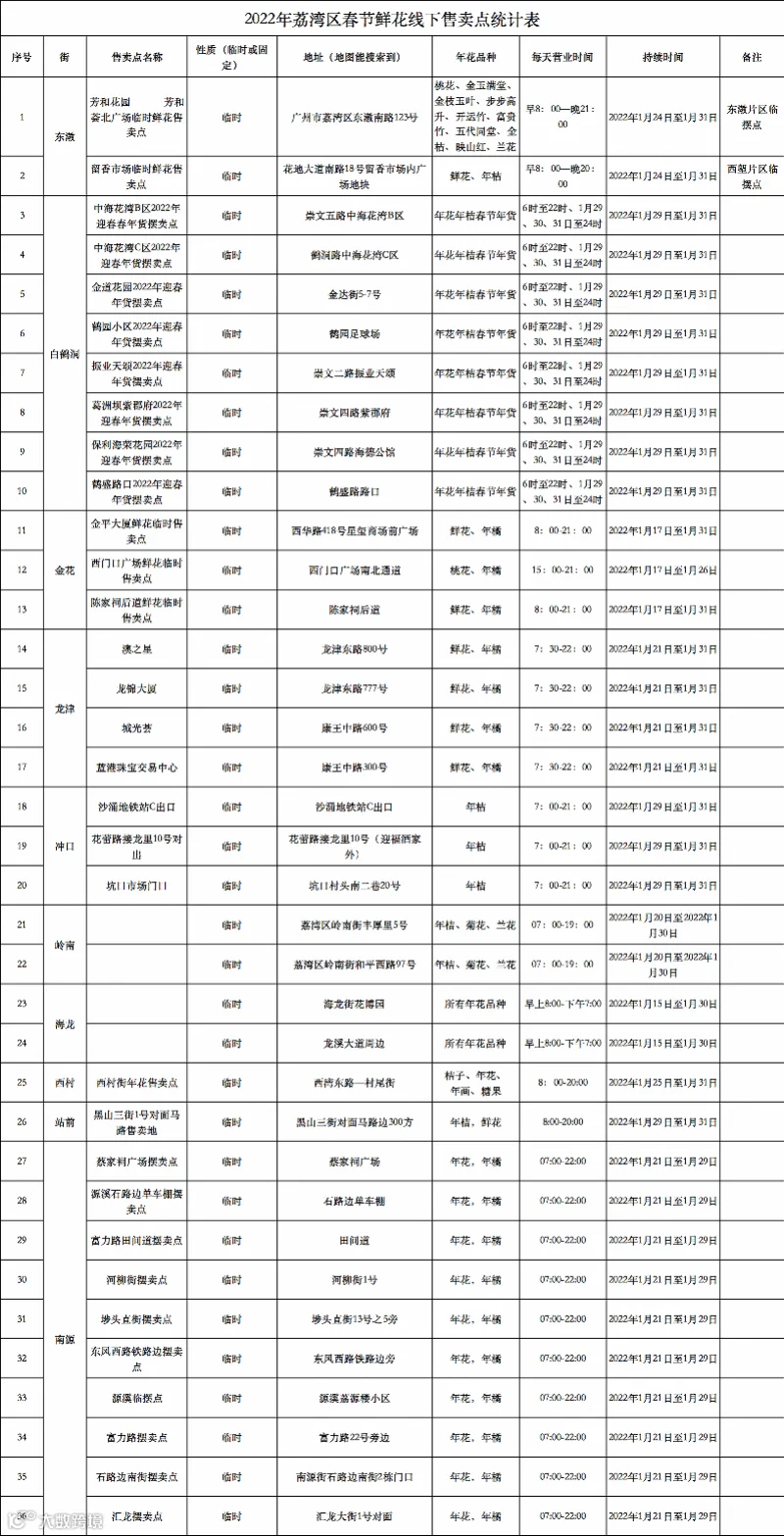 1月21日,记者从荔湾区获悉,鉴于目前疫情防控形势严峻复杂,根据广州市相关文件要求,在全面落实疫情防控措施的基础上,适当安排一些街、社区、村,选择户外开阔、通风良好的区域,合理设置春节鲜花临时售卖点,方便花农花商卖花,市民就近购花。经统计,荔湾区有