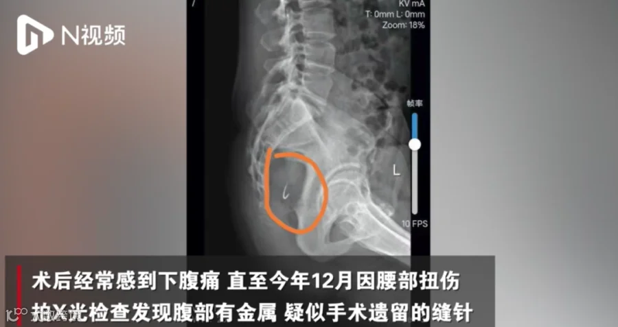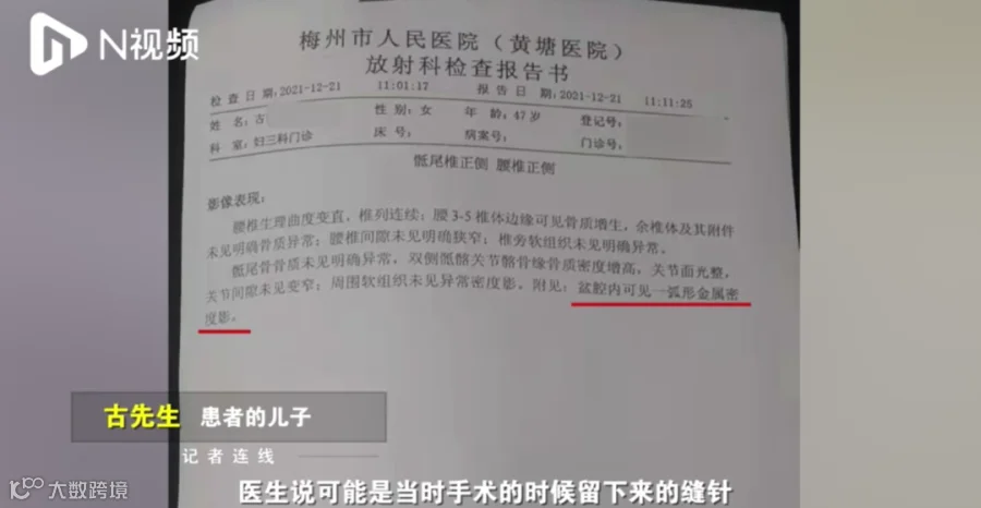 的古先生报料,其47岁的母亲古女士2013年因子宫肌瘤在梅州市人民医院做了微创手术,术后经常感到下腹痛,直至今年12月因腰部扭伤,拍X光检查发现腹部有金属,疑似手术遗留的缝针。