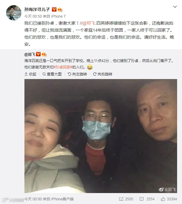,孙海洋与失散14年的儿子孙卓相认,并在深圳举行了认亲仪式。认亲成功后,孙海洋将孙卓送回阳谷继续读书。