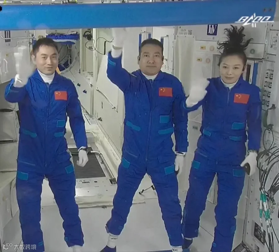 航天员王亚平(右一)与同事翟志刚、叶光富进驻中国空间站。