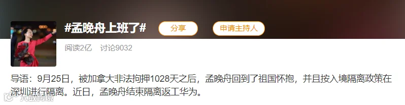 孟晚舟回到深圳后,按照“14+7”入境隔离政策,集中隔离14天后,再加7天居家隔离。结束隔离后,今天正式回到华为上班。