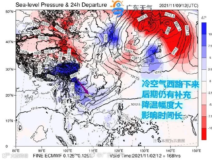 过程特点:冷空气西路下来,后面不断有补充,因此这次冷空气过程具有降温幅度大,影响时间长的特点。