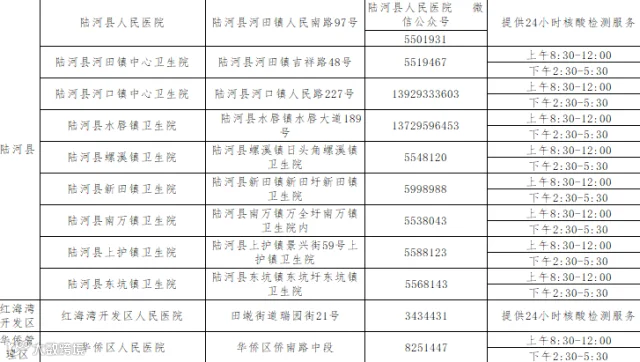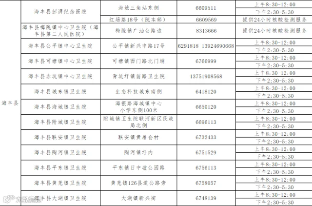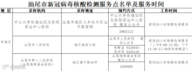 汕尾市核酸采样检测的医疗机构公布如下: