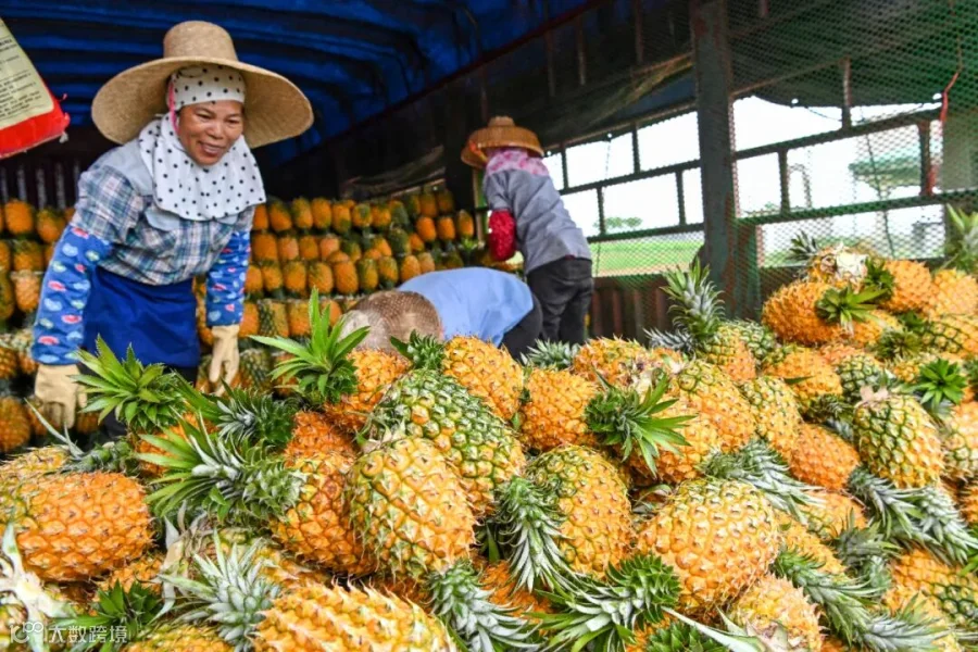 湛江市徐闻县曲界镇,工作人员将菠萝装放入货车