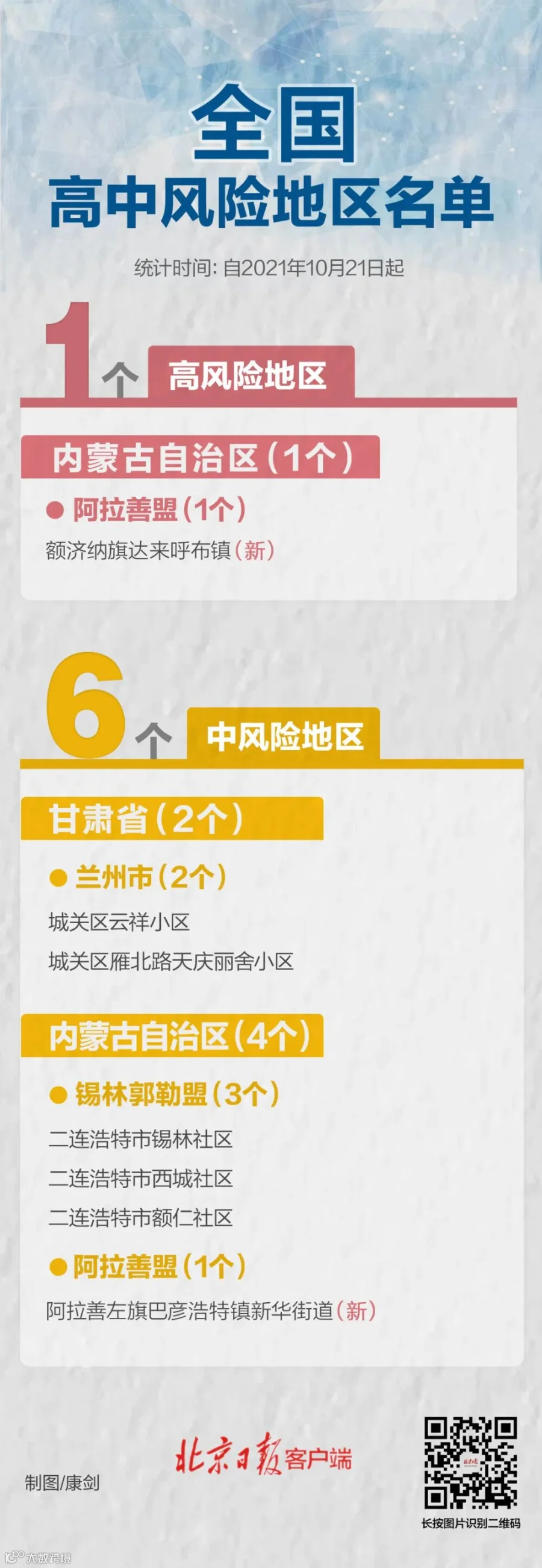 从10月21日起,内蒙古额济纳旗达来呼布镇镇区范围划定为高风险地区。