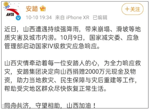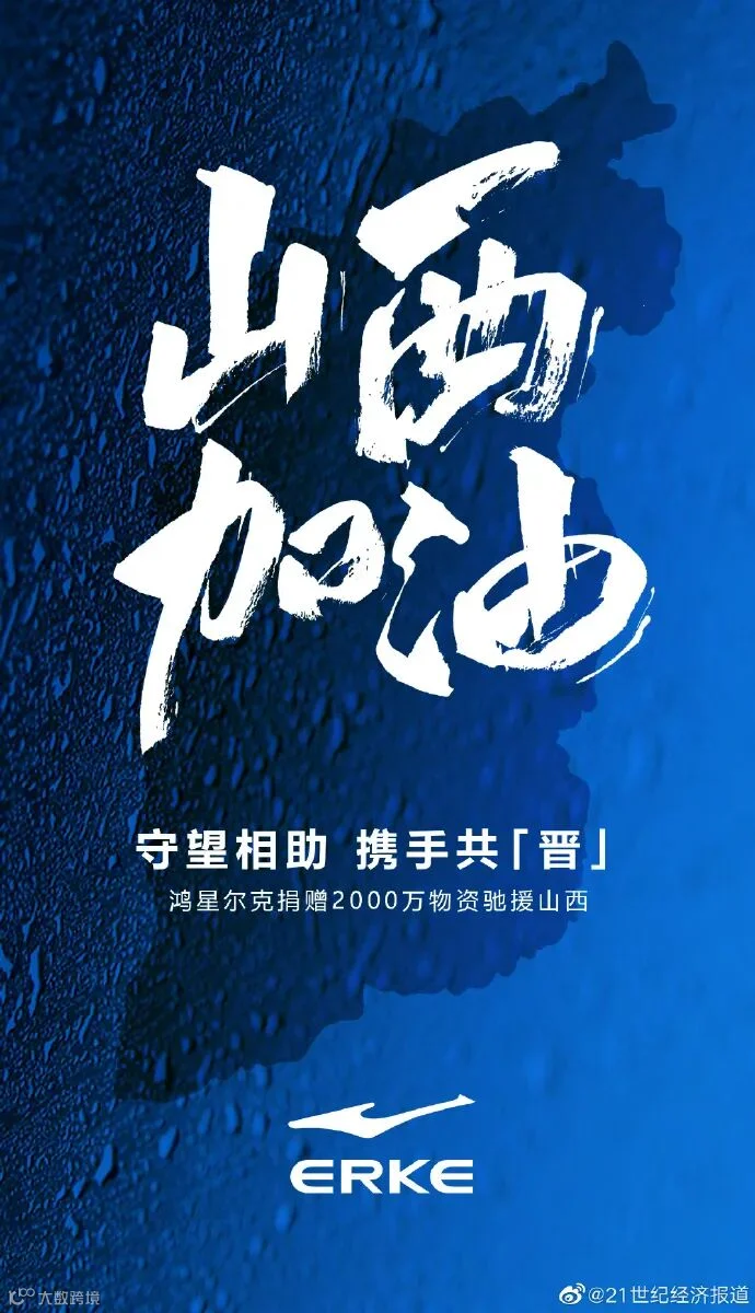 据@鸿星尔克官方微博 消息:鸿星尔克捐赠2000万物资驰援山西。