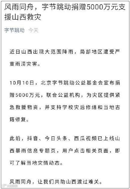 5.字节跳动捐赠5000万元驰援山西